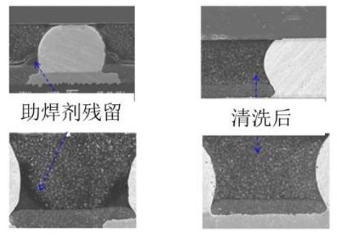 胶水成分内除了环氧树脂外还包含有其它各种固化元素,如固化剂,催化剂,交联剂等等。助焊剂残留可能与胶水中的固化剂发生反应而影响固化效果,助焊剂残留物对底部充胶质量有非常显著的影响。完成固化后的CSP锡球与Underfill材料间有明显的分离间隙。但清洗后样品锡球与填充材料的结合相当紧密,没有任何的间隙存在。